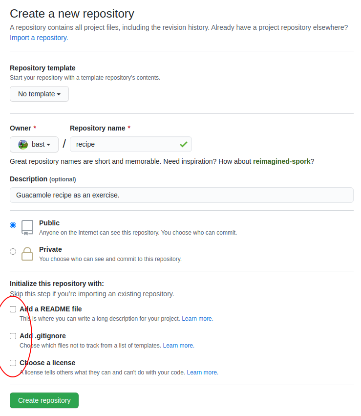 On this page choose a project name. For the sake of this exercise do not select “Initialize this repository with a README” (what will happen if you do?):