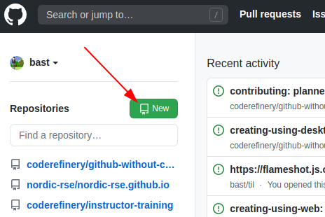 To create a repository we either click the green button “New” (top left corner):