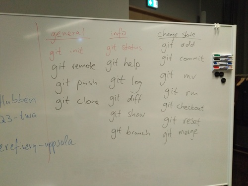 We also recommend to draw simple diagrams up on the board (eg: working directory - staging area - repository with commands to move between) and keep them there for students to refer to.
